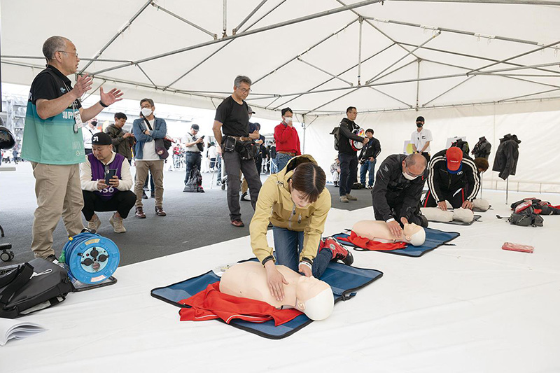オートバイ冒険家風間深志氏が出展する日本ライダーズフォーラム(JRF)ブースで、ライダーのためのFIRST AID講習を開催。