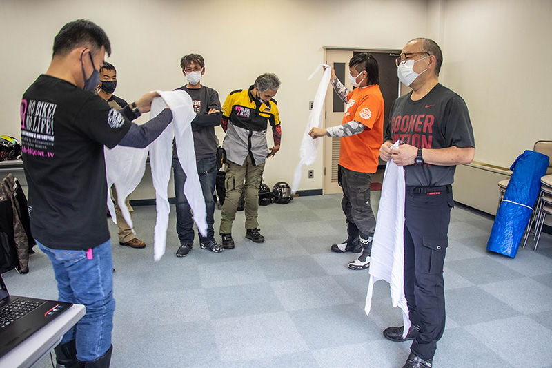 オートバイ冒険家風間深志氏が出展する日本ライダーズフォーラム(JRF)ブースで、ライダーのためのFIRST AID講習を開催。
