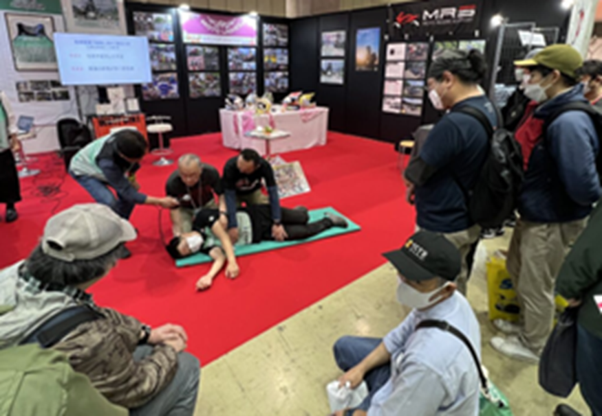 オートバイ冒険家風間深志氏が出展する日本ライダーズフォーラム(JRF)ブースで、ライダーのためのFIRST AID講習を開催。